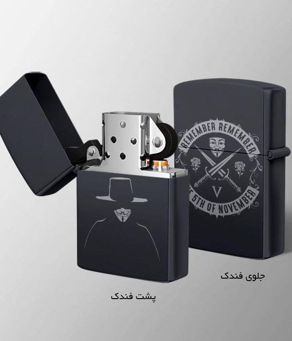 فندک زیپو مشکی با حکاکی طرح V for Vendetta